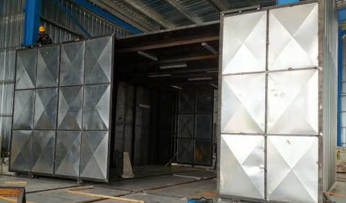 Es conformada por módulos con dobleces tipo “C” construidos en chapas de acero galvanizadas con espesor de 2,7 mm. Estos módulos tienen agujeros oblongos que facilitan el ensamble de uno a otro dando como resultado una estructura autoportante de estabilidad garantizada. En el área interna de las paredes existe un revestimiento con cortinas de goma resistente a la abrasión con un espesor de 1/8”, que tiene como función proteger las paredes de la cámara de trabajo contra la abrasión y reducir el nivel de ruido. Dimensiones de la cámara de trabajo de acuerdo con las necesidades del cliente.