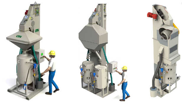 Extremamente eficiente y preciso, el purificador de abrasivos CMV es de fácil regulación, además de ser prácticamente exento de mantenimiento (menor costo operacional). Opcional malla vibratoria y sistema con una o dos tolvas de almacenamiento de abrasivo.