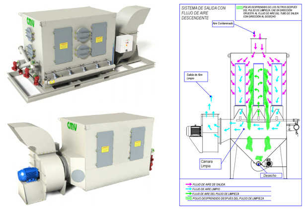 Construcción compacta y resistente, con un sistema de flujo de aire descendente que garantiza perfecta hermeticidad, permitiendo un alto rendimiento. Posee elementos filtrantes (cartuchos) con una elevada vida útil, gracias a los diferentes materiales en que son fabricados. Los colectores de polvo BMF están equipados con los siguientes componentes: