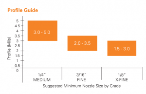 Aplicable para chorro delgado que requiere una superficie limpia y perfil mínimo de anclaje incluyendo brush-off blast o sistemas de limpieza con agua a alta presión. Requiere un tamaño mínimo sugerido de la boquilla de 1/8″ y en condiciones de chorro estándar lograrán un perfil 1-2,6 Mil.