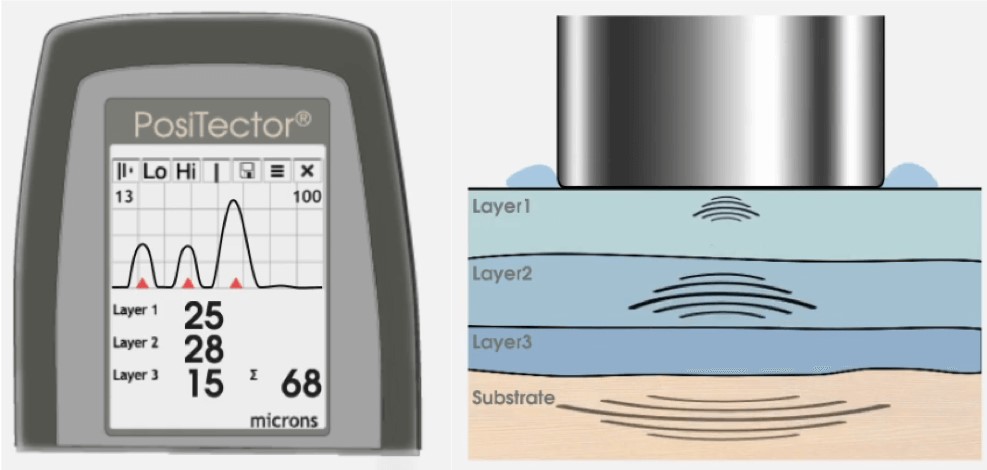 Los medidores de espesor de recubrimientos ultrasónicos (por ejemplo, PosiTector 200) emiten un pulso de sonido de alta frecuencia que viaja hacia el recubrimiento a través de un gel de acoplamiento y se refleja en CUALQUIER superficie que sea de diferente densidad. Las lecturas del espesor de la pintura se obtienen midiendo el tiempo que tarda la señal ultrasónica en propagarse desde la sonda a la interfaz revestimiento/sustrato y viceversa. El tiempo de viaje se divide por dos y se multiplica por la velocidad del sonido en el revestimiento para obtener el espesor del recubrimiento.
