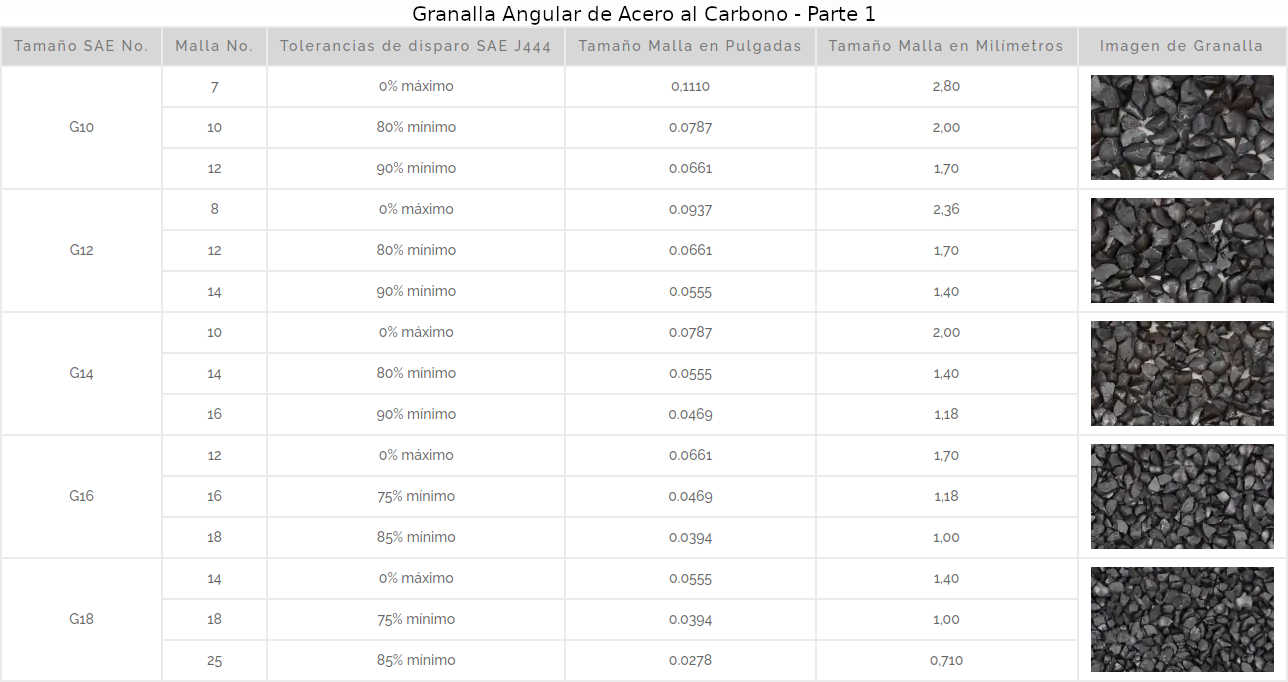 Tamaño SAE No. | Malla No. | Tolerancias de disparo SAE J444 | Tamaño Malla en Pulgadas | Tamaño Malla en Milímetros | Imagen de Granalla |