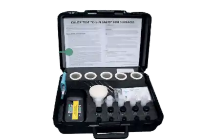Chlor*Test Kit es un kit de prueba de sales que contiene todo lo necesario para la medición precisa y fácil de cloruros en las superficies metálicas, Chlor*Test mide en (ppm) y (µg/cm2).