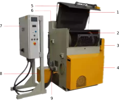 Cuenta con un control numérico en el que se programa el tiempo del ciclo para cada proceso de limpieza. En su parte posterior se ubican los sacos colectores de polvo. Para su instalación solo requiere un espacio de 1.5 * 1.8 m requiriendo para su operación un espacio de tan solo 3 m, su nivel de ruido es bastante bajo.