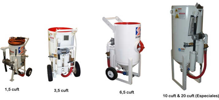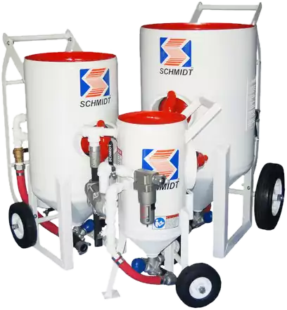 Los sistemas de limpieza de superficie portátiles SCHMIDT® son los caballos de batalla de la industria de chorro de aire abrasivo (Granallado y/o SandBlasting), diseñadas para proporcionar la caída de presión más baja de la industria – menos de 1,5 psi y en algunos casos menos de 1 psi – en comparación de 10 a 14 psi de otros sistemas en el mercado. Es importante tener en cuenta que por cada caída de 1 psi en la boquilla, hay una correspondiente pérdida de 1,5% en la productividad.